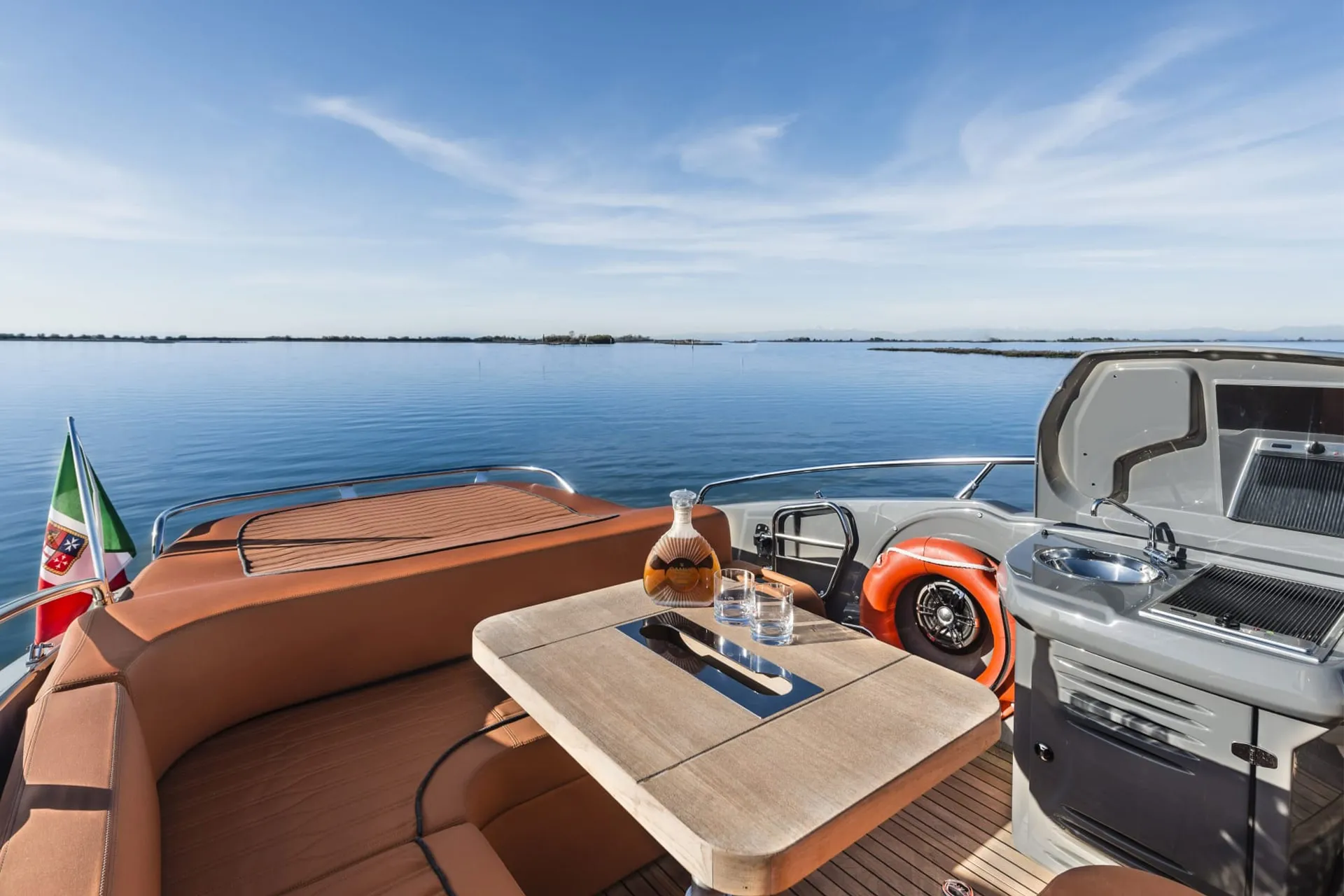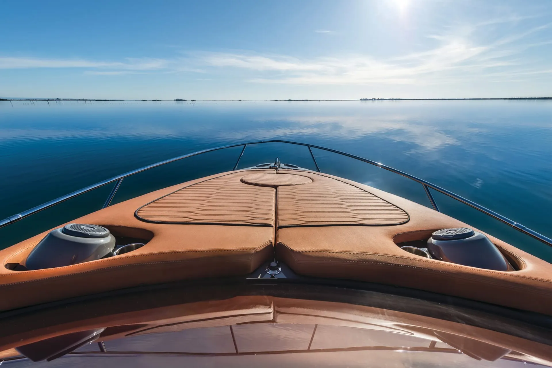 The E30 Endurance is the Cranchi shipyard newest model of luxury yacht in Lake Como. It is a sporty elegant daycruiser known for its fun, agile handling and comfortable walkaround design. It's a versatile boat, suitable for both day trips and weekend getaways, offering a balance of style and functionality. The model is demonstrated by the teak clad bow deck, recalling the classic heritage of wooden boats which acts as a visual counterpoint to the teak-clad stern platform.